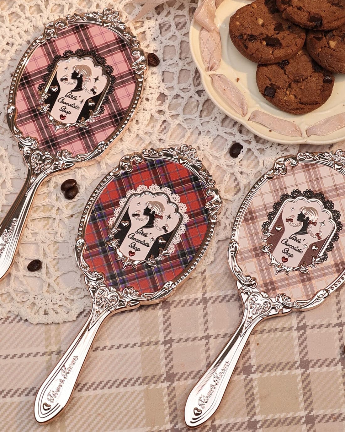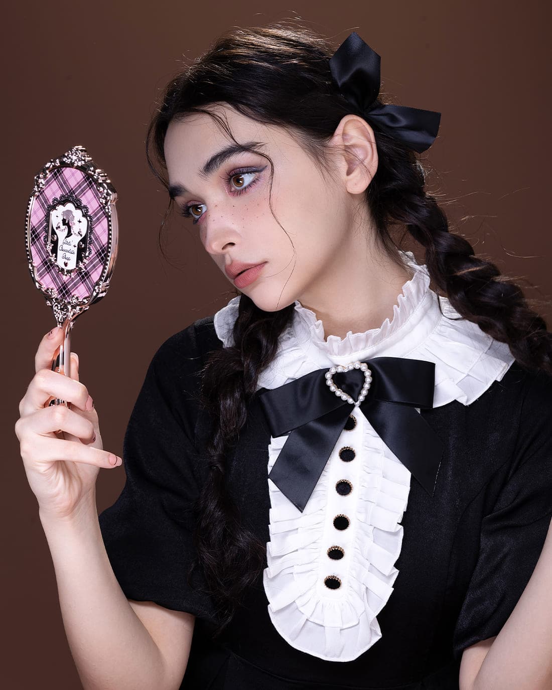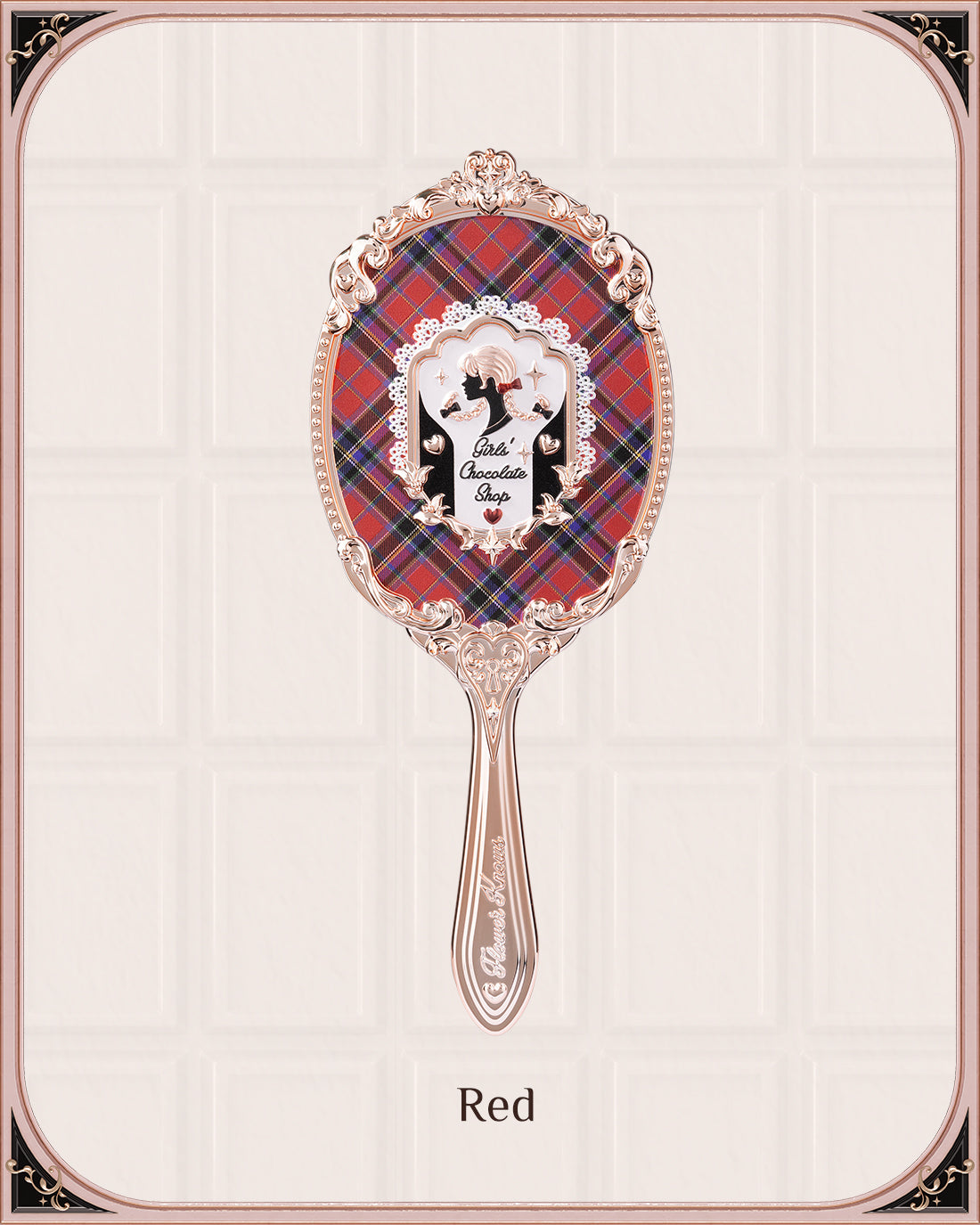 🪞 Inspired by the british plaid, and the silhouette portrait of a girl with a twist braid is the core design focus, combination of gold lattice, and lace elements of clothing;