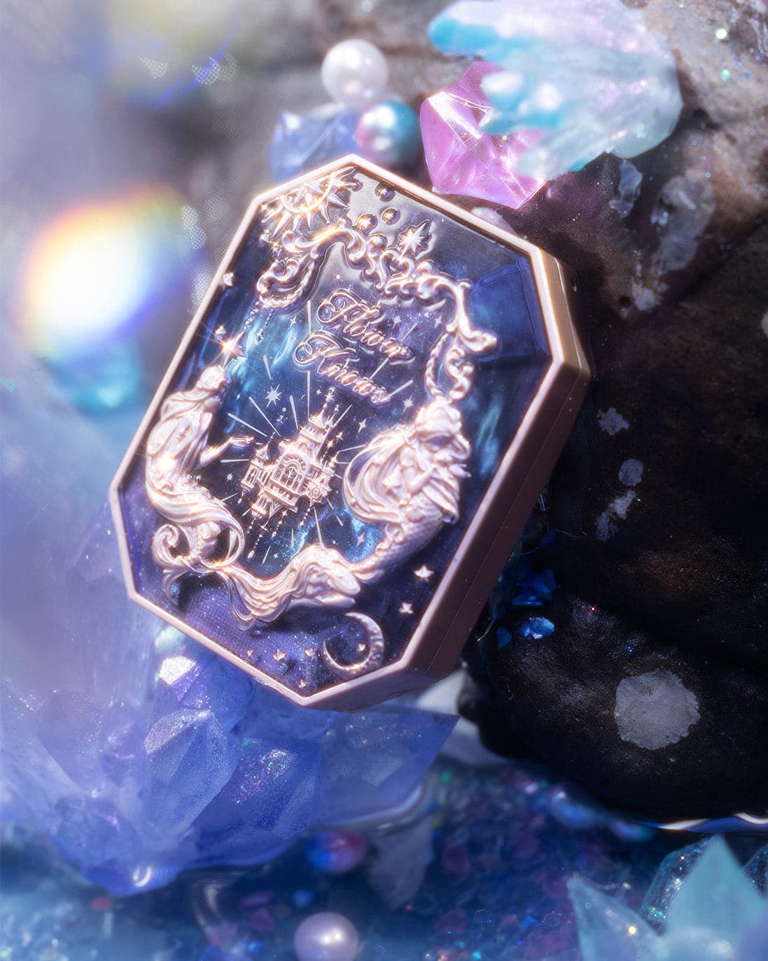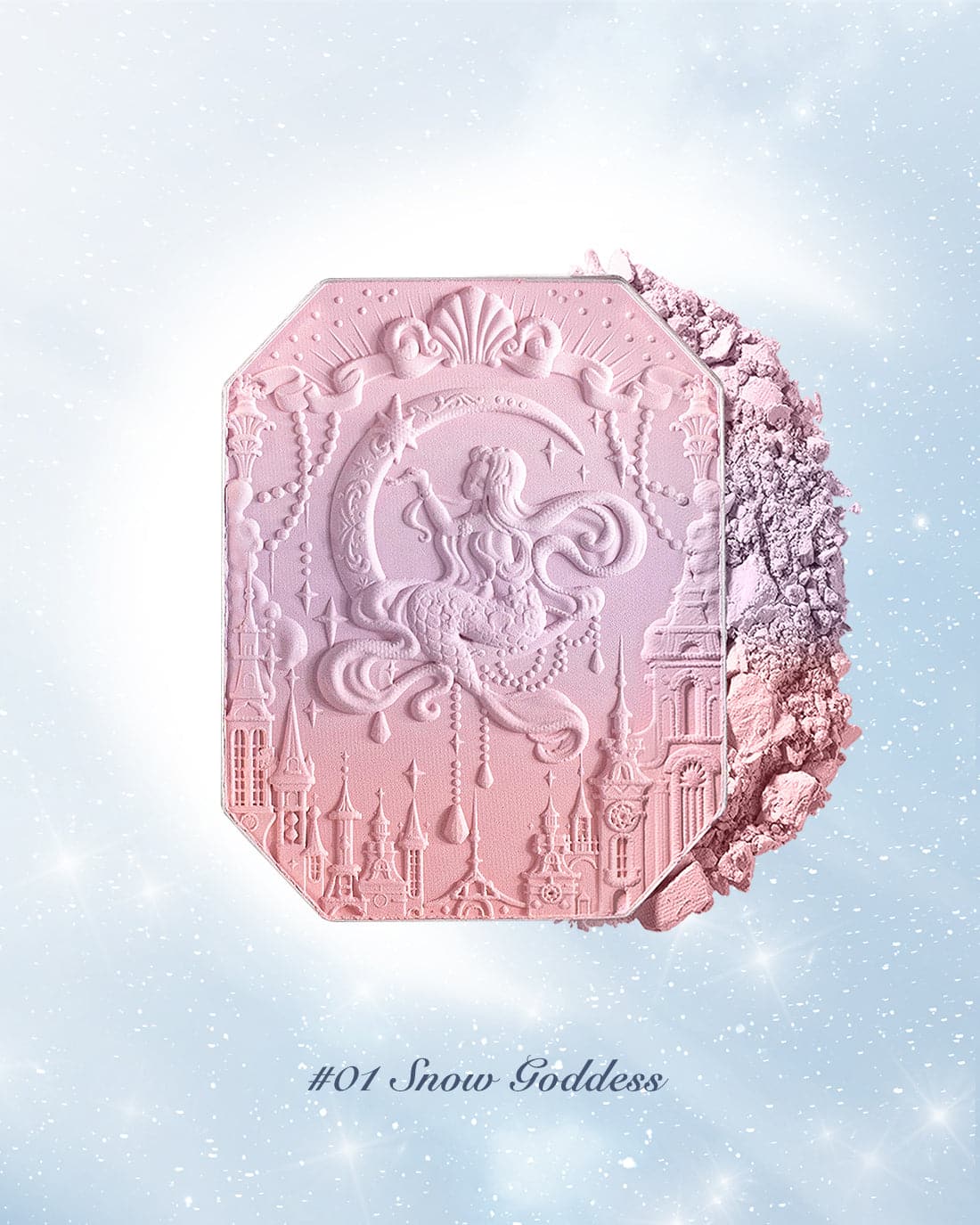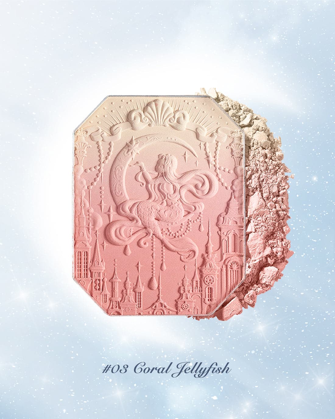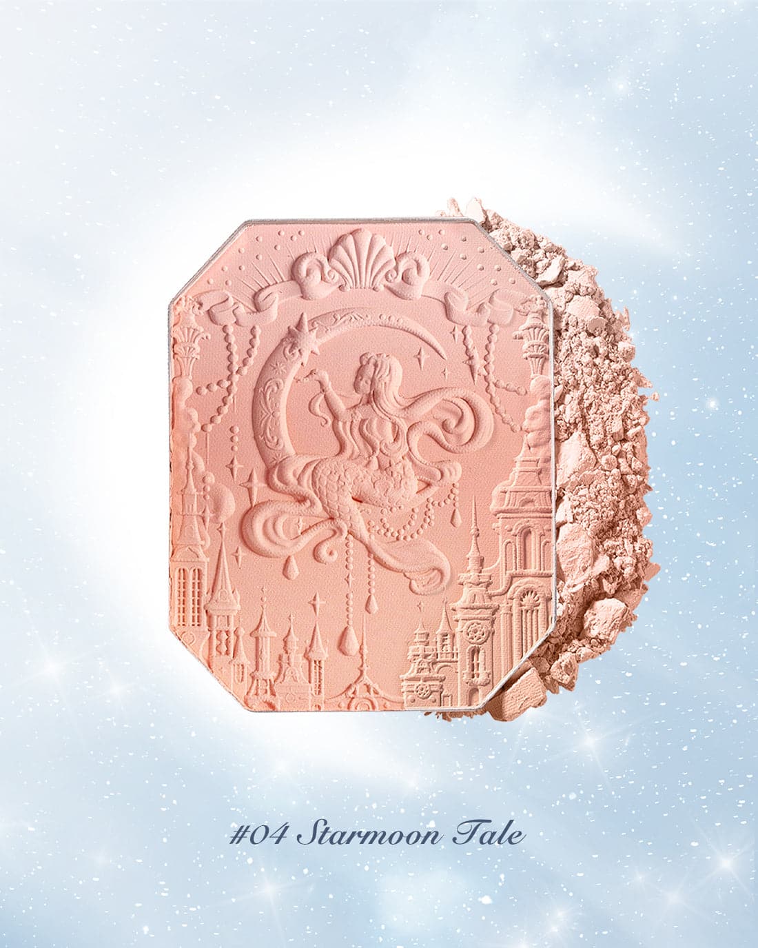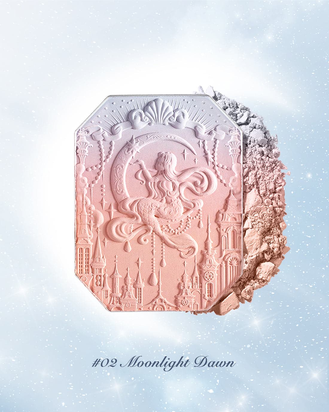 👑 Inspired by the dreamy colors of the clouds, creating sunset-like three-color gradient blush. The poster-like emboss adds a touch of elegance, while a mermaid sitting on the moon holds up the star, adding a touch of whimsy.