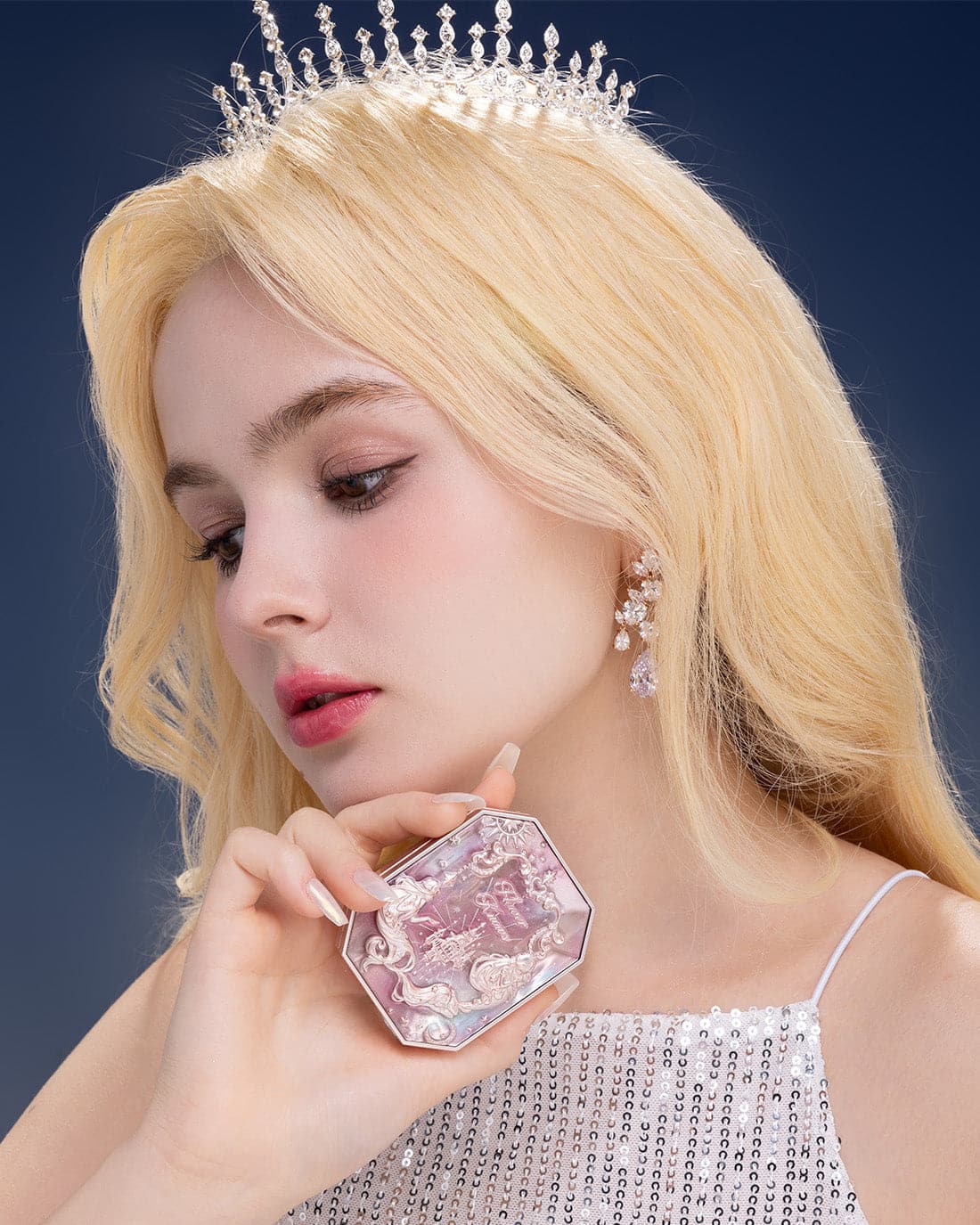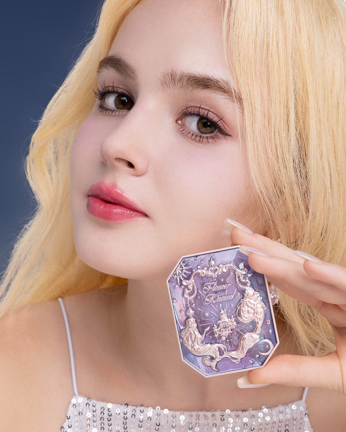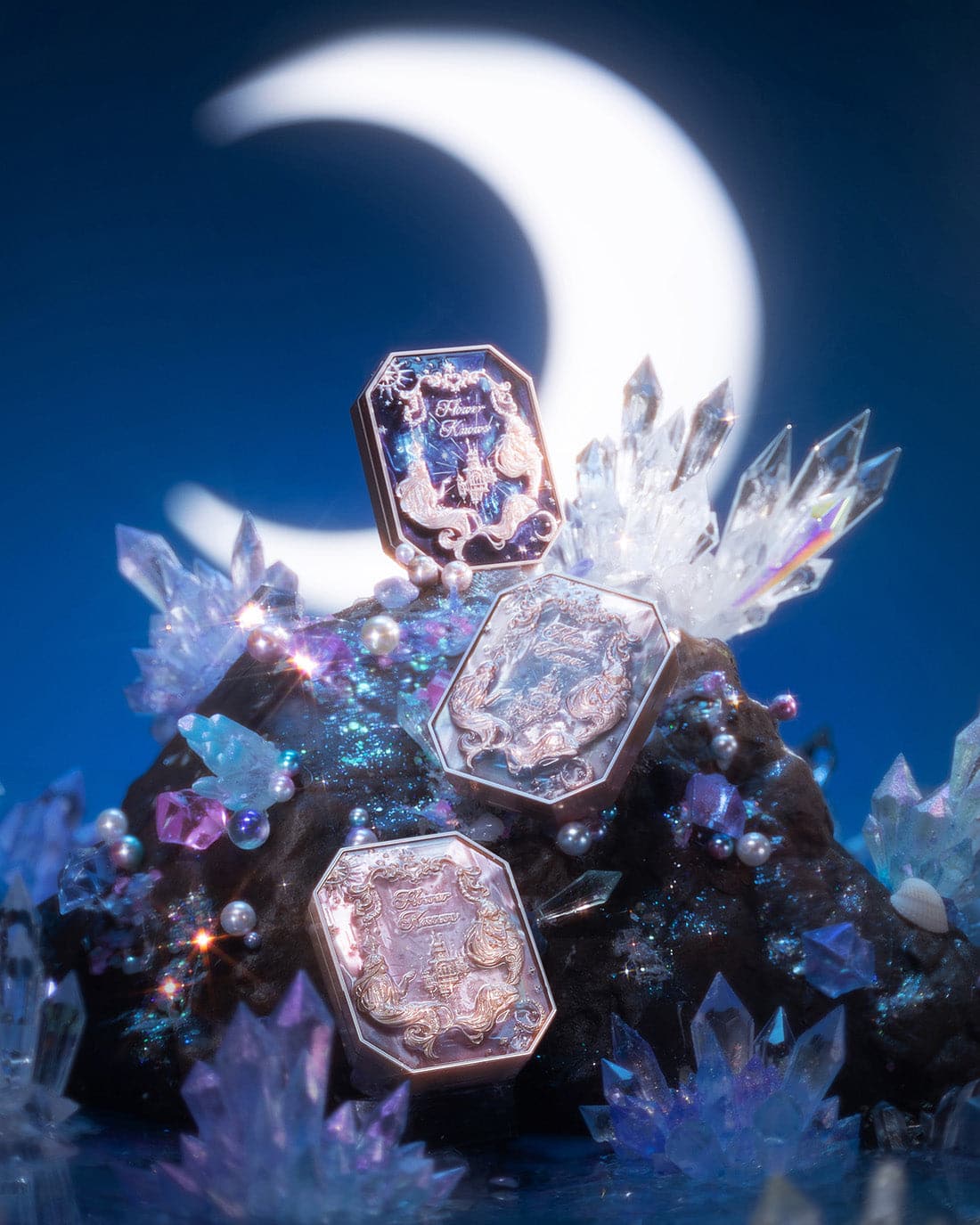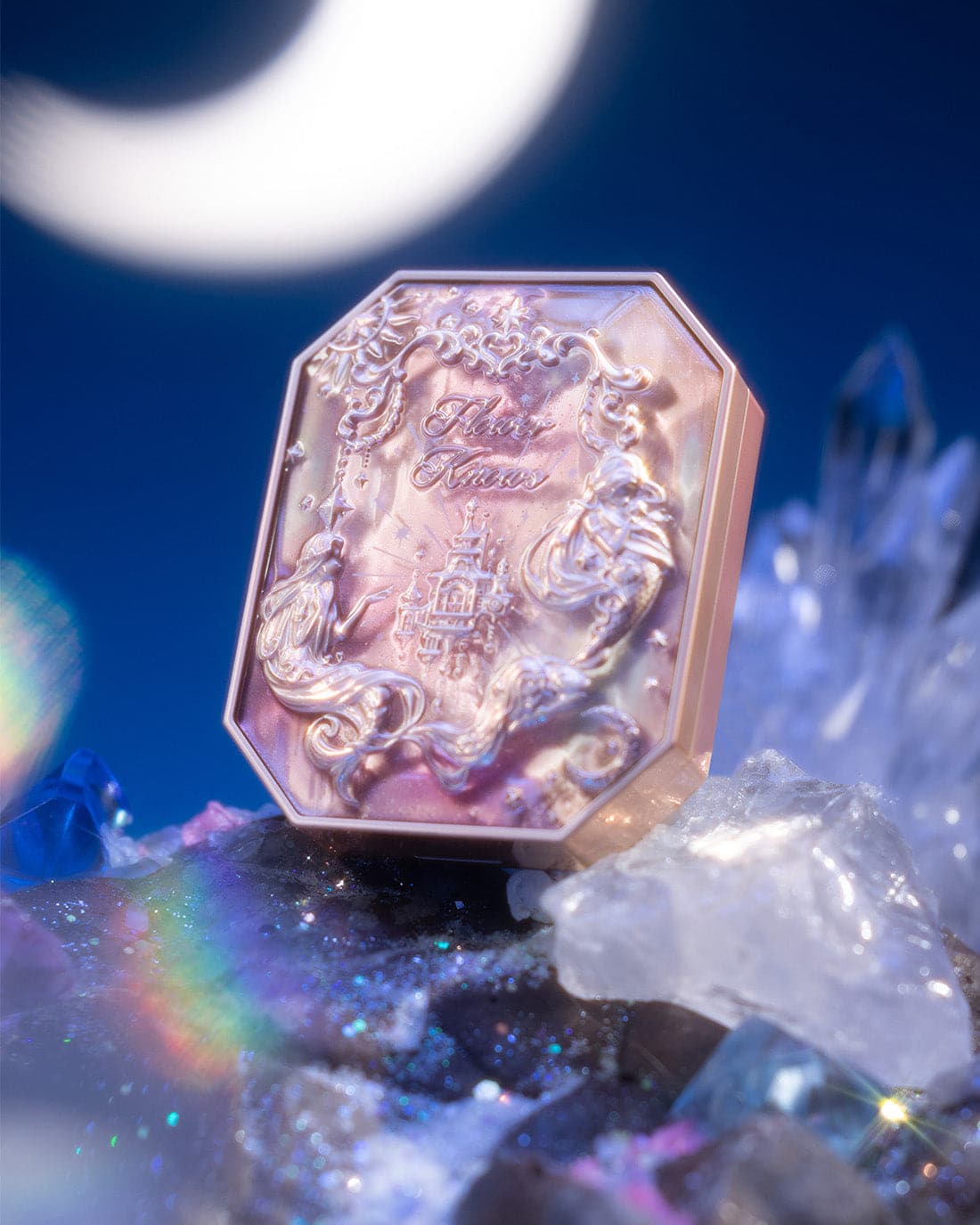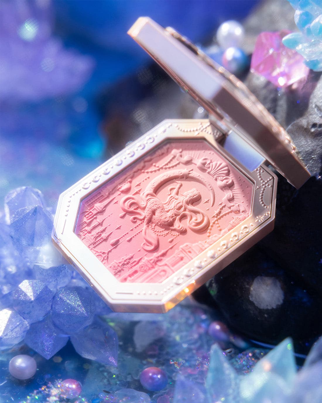 👑 Inspired by the dreamy colors of the clouds, creating sunset-like three-color gradient blush. The poster-like emboss adds a touch of elegance, while a mermaid sitting on the moon holds up the star, adding a touch of whimsy.