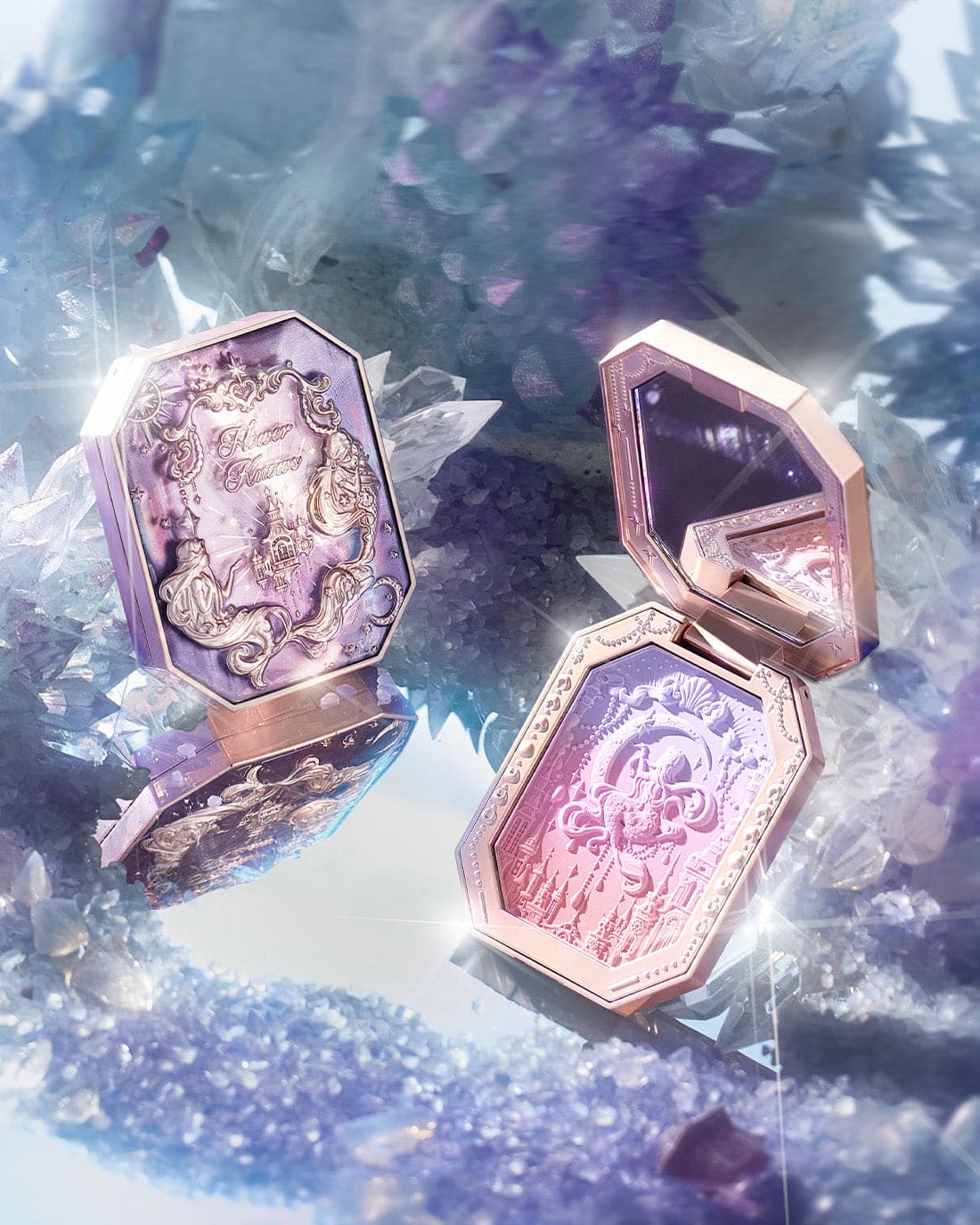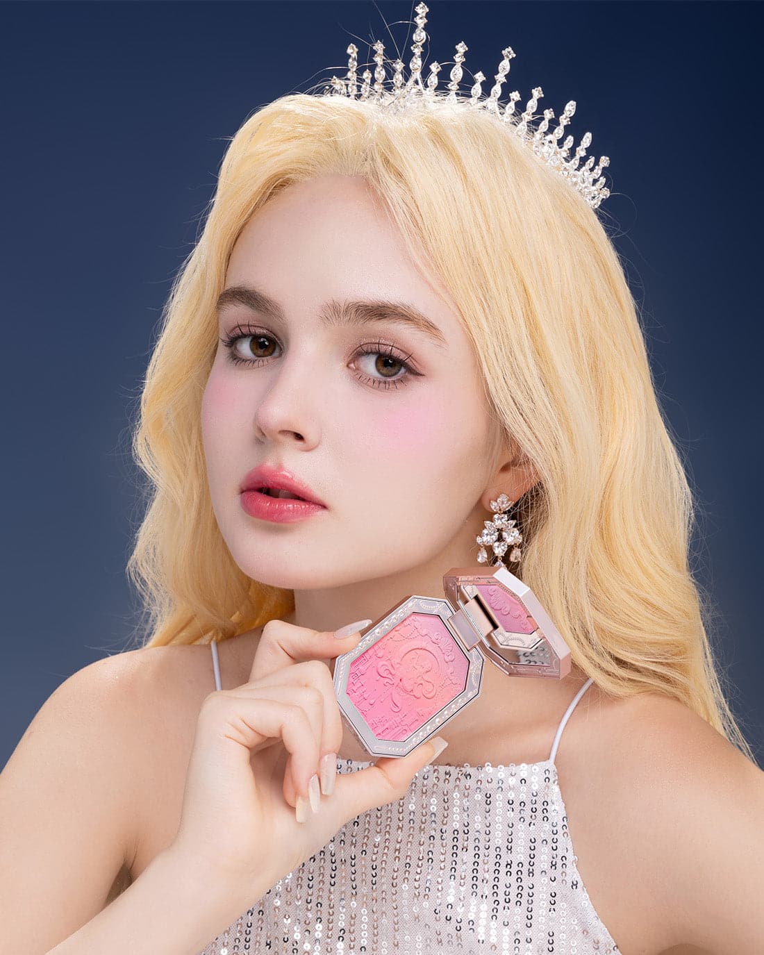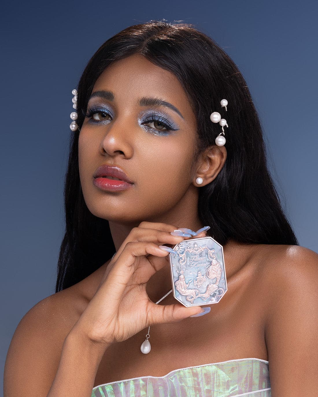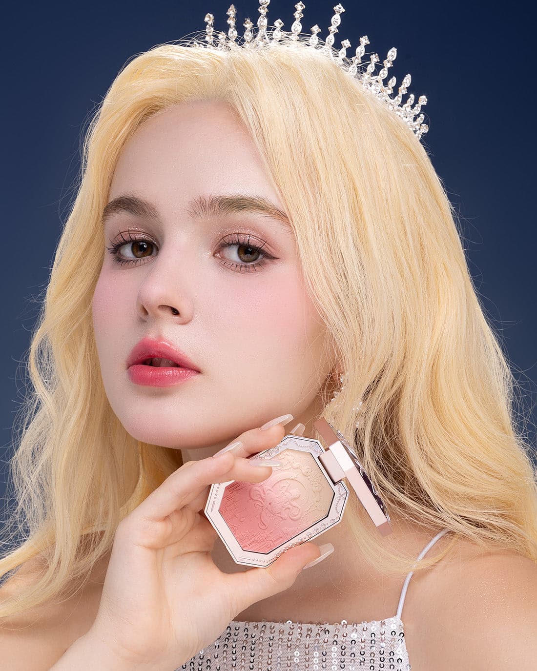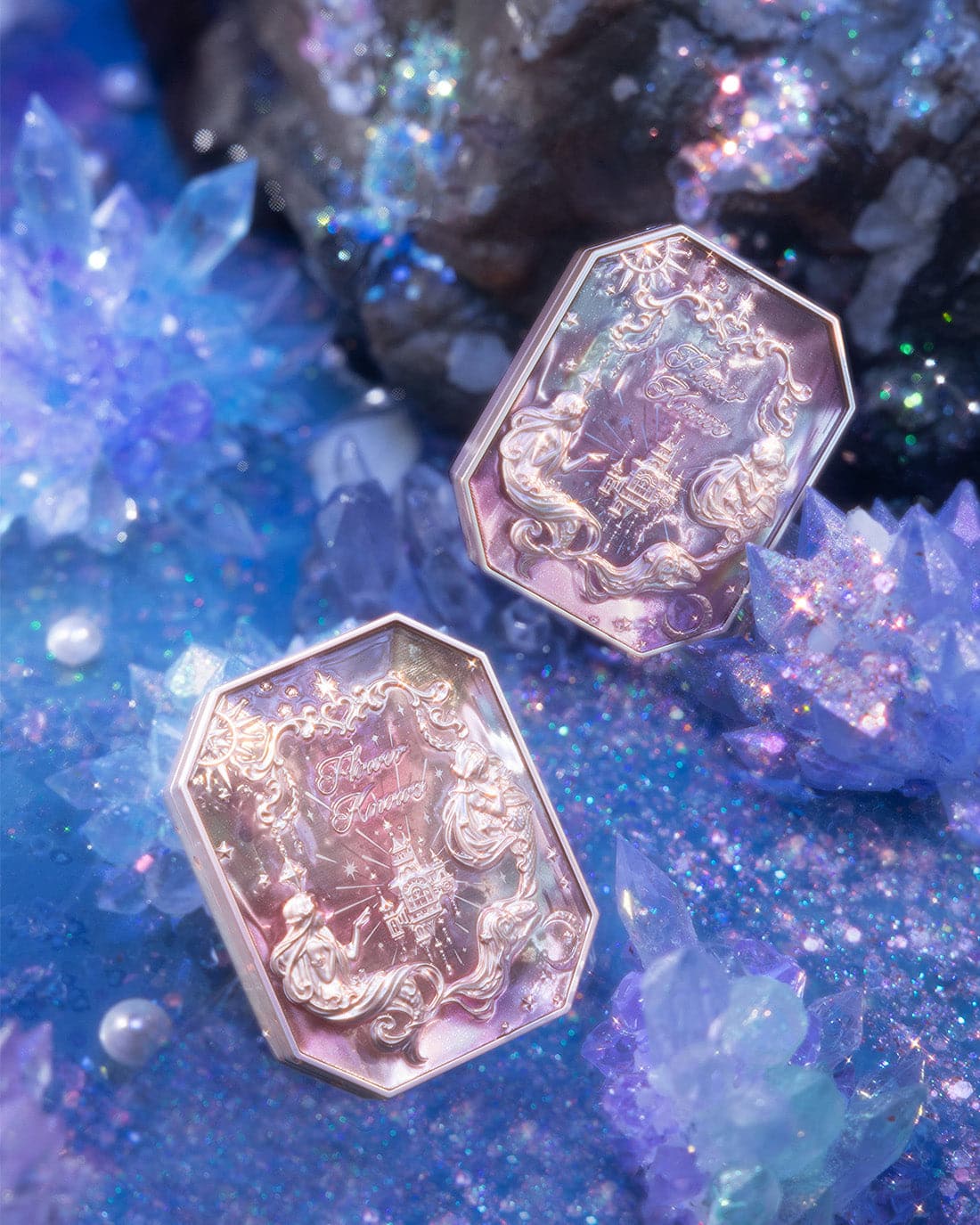 👑 Inspired by the dreamy colors of the clouds, creating sunset-like three-color gradient blush. The poster-like emboss adds a touch of elegance, while a mermaid sitting on the moon holds up the star, adding a touch of whimsy.